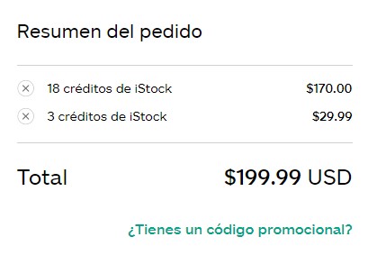 Luego tienes que elegir el producto en el que deseas emplearlo; finalmente, podrás ver en el resumen de tu compra la pregunta «Tienes un Código Promocional?». Al hacer click en ella saldrá el campo para copiar el código descuento iStockphoto.